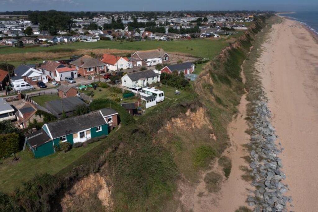 | Vue aérienne montrant l'érosion touchant la côte à Great Yarmouth, dans le sud-est du Royaume-Uni, le 16 août. |