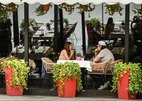 | Un couple est assis dans un café quasi désert du centre de Moscou, où flambent les contaminations au COVID-19, le 4 juillet. |