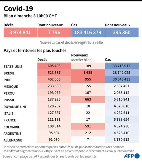 Le COVID-19 a fait au moins 3,974 millions de morts depuis son apparition fin 2019, selon un bilan établi dimanche 4 juillet par l'AFP.