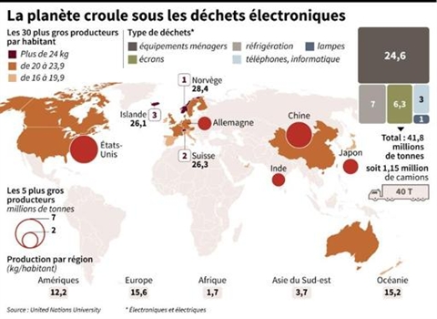 Selon l'étude, la Norvège est le pays qui produit la plus grande quantité de e-déchets par habitant, avec 28,4 kg, suivi de la Suisse (26,3 kg) et l'Islande (26,1 kg). La France arrive en 8e position, avec 22,2 kg par habitant. La région qui génère le moins de e-déchets est l'Afrique, avec un rejet estimé à 1,7 kg par habitant. Au total, le continent a produit 1,9 millions de tonnes de ces déchets.