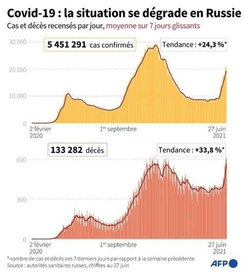 Ce pays, où la campagne de vaccination est à la traîne en raison de la méfiance de la population, recensait samedi des contaminations en hausse de 25% sur sept jours par rapport aux sept jours précédents, avec des décès augmentant de 33%. Dimanche 27 juin, Moscou (plus de 12 millions d'habitants) a annoncé avoir enregistré 144 morts en 24 heures, le pire bilan depuis le début de la pandémie.