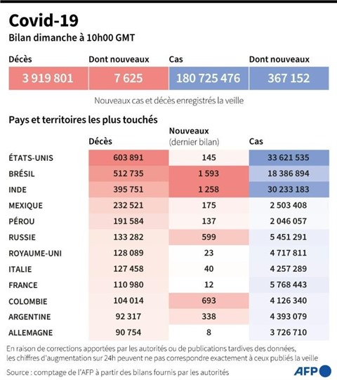 Identifié pour le première fois en Inde, le variant Delta, plus contagieux, est désormais présent dans au moins 85 pays, selon l'Organisation mondiale de la santé (OMS), faisant craindre, malgré les campagnes de vaccination, de nouvelles vagues de la pandémie qui a déjà fait près de quatre millions de morts. Le Portugal, qui a resserré ses restrictions dans les villes les plus touchées dont Lisbonne, a été le premier État de l'Union européenne à annoncer qu'il était désormais dominant sur son territoire.