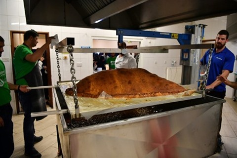 Le samossa a été réalisé sur une immense grille, avant d'être acheminé vers une cuve géante pleine d'huile bouillante, puis sorti pour être pesé.