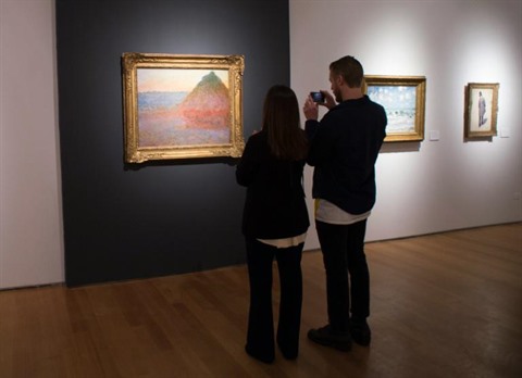 | Des journalistes devant le tableau de Claude Monet intitulé Meule, le 4 novembre à New York. |