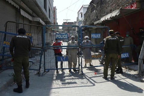 | Des policiers bloquent un quartier à Lahore (Pakistan), le 17 juin pour éviter les contaminations. |