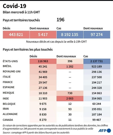 Aux États-Unis, 117.290 décès ont été enregistrés , soit plus que le nombre de soldats américains tués durant la Première Guerre mondiale (environ 116.500 selon le département des Anciens combattants). La pandémie continue de faire rage en Amérique latine et aux Caraïbes, qui ont dépassé les 80.000 décès. La moitié est recensés au Brésil, deuxième pays le plus endeuillé. Le Chili a passé le seuil des 220.000 contaminations mercredi 17 juin.