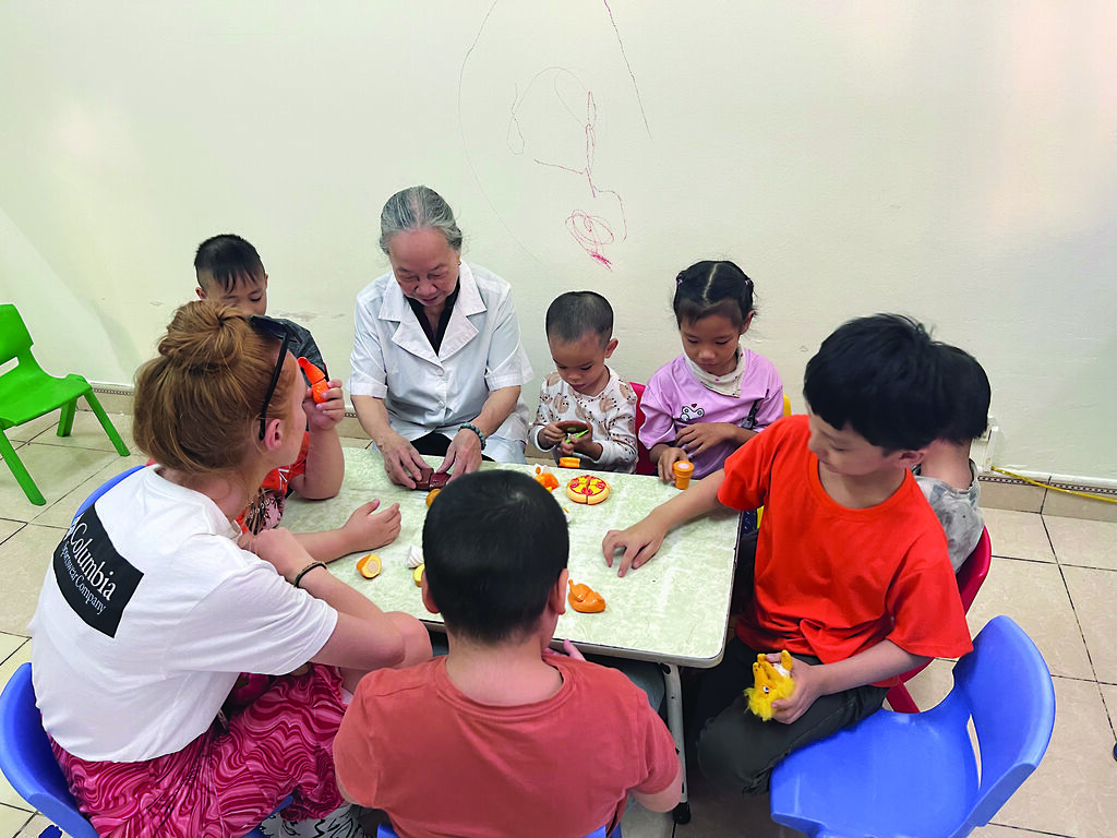| Mme Nga et une volontaire étrangère jouent avec des enfants du centre Hy Vong. |