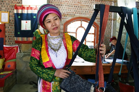 | Vàng Thi Câu, chef du groupe de production de la coopérative de services généraux en agroforesterie dans la commune de Sa Phin, province de Hà Giang, présente un article de brocart. |
