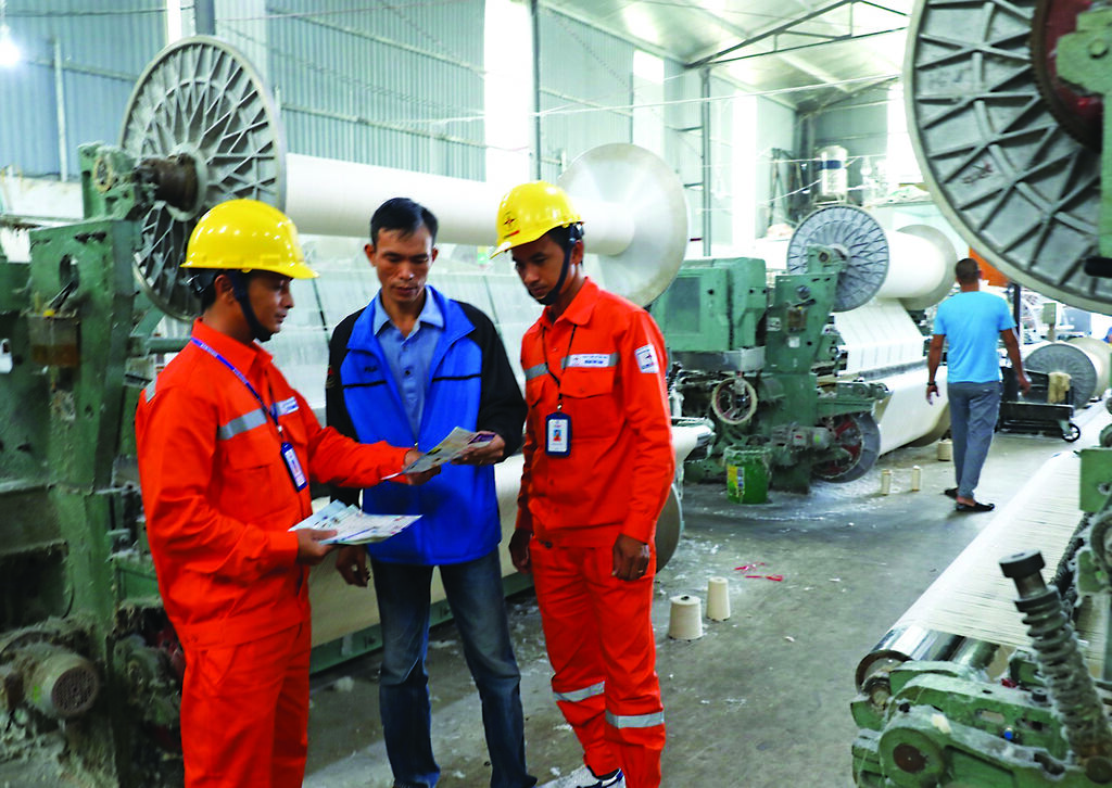 | Deux agents d'EVN initient un employé d'une usine aux solutions pour économiser l'électricité dans la production. |