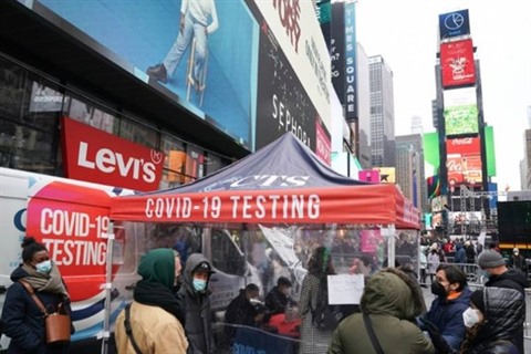 | File d'attente devant un site de tests pour le COVID-19 sur Times Square à New York, le 28 décembre. |
