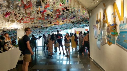 "Vous voyez là ce que fabrique une famille de quatre personnes pendant six mois. Donc vous imaginez la quantité des déchets à Hanoï", a fait savoir Marie-Lan Nguyen Leroy, responsable de projet QV2 quand elle aborde l’installation "La vague déferlante" dans l’exposition.
