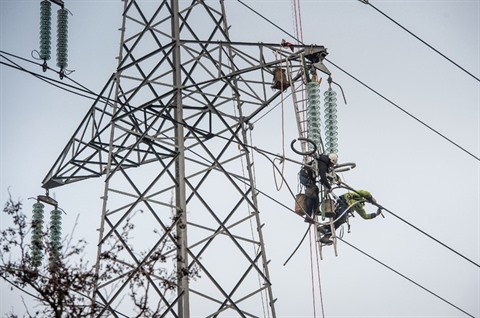 | Salarié du Réseau de transport d'électricité en intervention sur une ligne à 225000 volts à Eygalières (Bouches-du-Rhône, France), le 9 octobre 2015. |