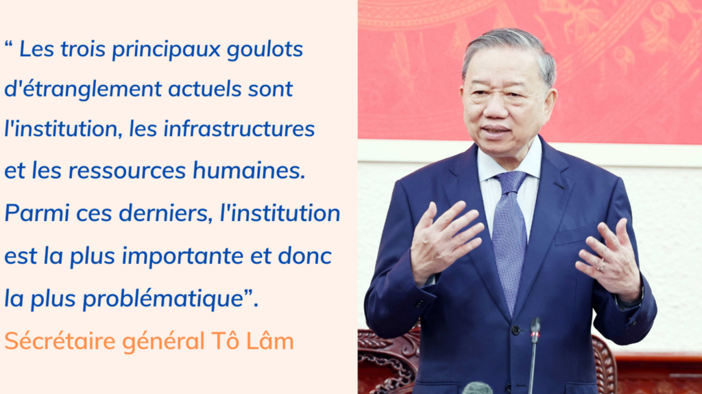 À partir de cette orientation, le secrétaire général a exigé que la construction des lois et des décrets soit véritablement dynamique, qu'elle traduise fidèlement les orientations du Parti, reflète la réalité, réponde aux besoins concrets et résolve les problèmes pratiques. Il a insisté sur la nécessité de lever les "goulots d'étranglement" juridiques.