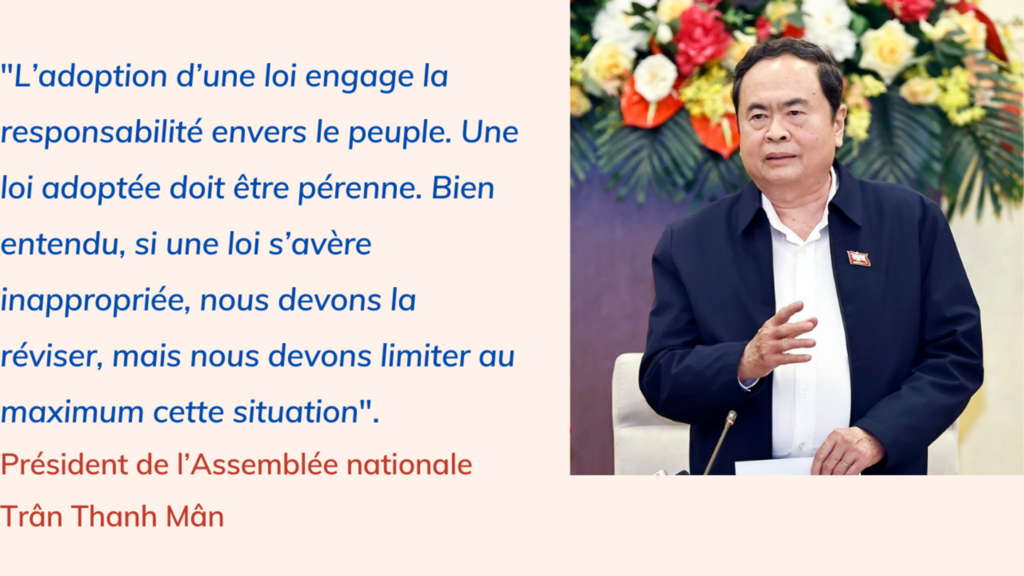 "Les lois et résolutions adoptées par l'Assemblée nationale doivent être de haute qualité et durables, créant des conditions favorables et accordant au gouvernement l'autonomie et la flexibilité nécessaires pour organiser leur mise en œuvre", a-t-il déclaré.