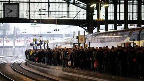 | Des personnes sur un quai de la gare Saint-Lazare à Paris lors d'une grève à la SNCF, le 9 mars 2016. |