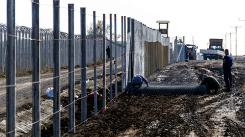 | Des détenus érigent une clôture à la frontière hongro-serbe dans le village de Gara, le 27 octobre 2016, destinée à empêcher des migrants d'entrer en Hongrie. |