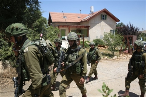 | Des soldats israéliens à l'extérieur de la maison où une adolescente a été tuée le 30 juin à Kyriat Arba, en Cisjordanie. |