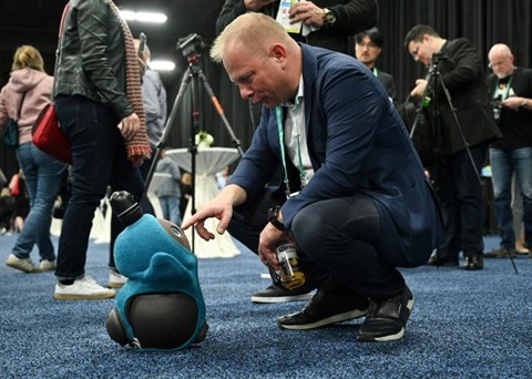 | Un participant interagit avec le robot Lovot de Grooxe X, lors du CES de 2020 à Las Vegas. |