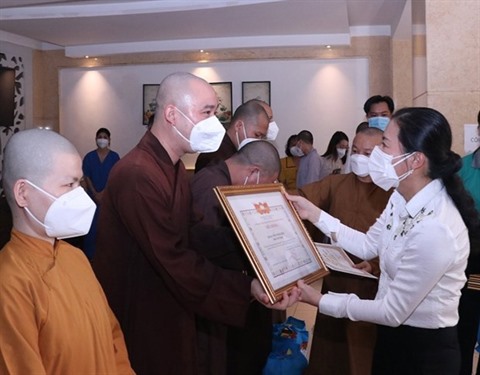 | Phan Kiêu Thanh Huong, vice-présidente du Comité du Front de la Patrie du Vietnam de Hô Chi Minh-Ville honore les volontaires religieux ayant participé au programme de soutien aux forces en première ligne dans la lutte contre le COVID-19. |