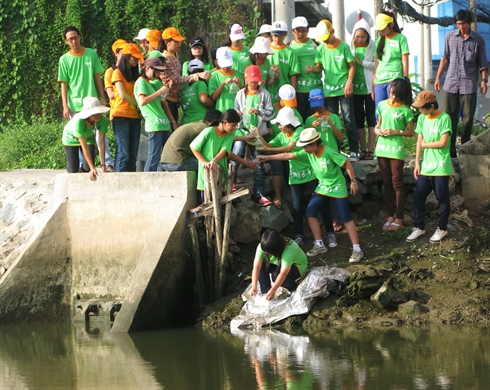 | Une vingtaine d’élèves, membres du Club “J’aime la nature” du magazine Le foulard rouge, ont remis le 20 mai des poissons autochtones dans le fleuve Sài Gon. |