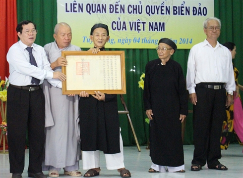 | Cérémonie de réception d'anciens documents concernant la souveraineté maritime et insulaire du Vietnam, remis par la lignée Lê, de la commune de Binh Thanh (province de Binh Thuân). |