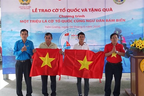 | La cérémonie de la remise de drapeaux nationaux aux pêcheurs à Tiên Giang le 6 juin. |