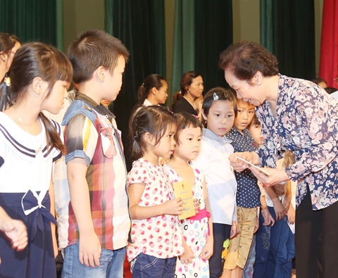 | La vice-présidente Nguyên Thi Doan remet des bourses d’études à des élèves en situation difficile, le 12 août dans la province de Hà Nam (Nord). |