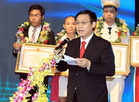 | Vuong Dinh Huê lors de la cérémonie de remise de prix à dix jeunes figures exemplaires du Vietnam en 2015. |