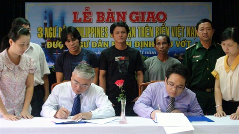 | Cérémonie de remise de trois pêcheurs philippins, secourus au large de l'archipel de Truong Sa (Spratly), au représentant du consulat des Philippines au Vietnam, le 13 novembre dans la province de Binh Dinh (Centre). |