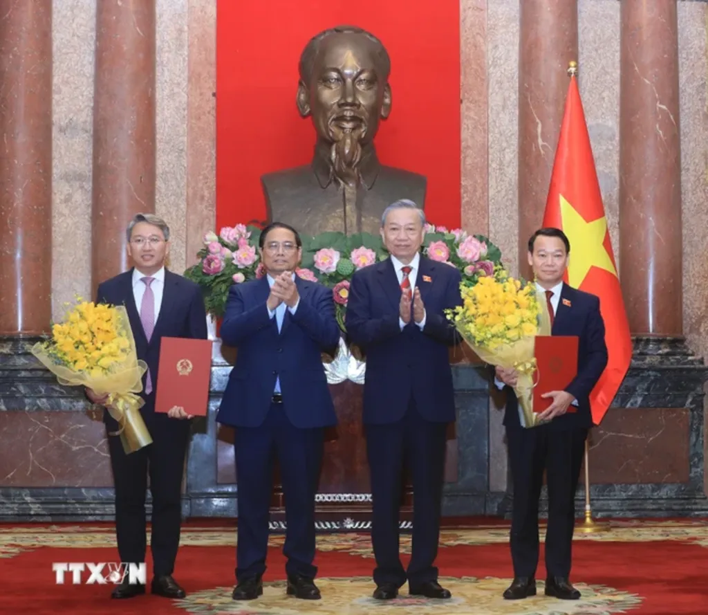 Avec l'autorisation du président, le chef adjoint du bureau présidentiel, Pham Thanh Ha, a annoncé les décisions du président de nommer Nguyên Hoa Binh, Hô Duc Phoc et Bùi Thanh Son au poste de vice-Premier ministre, celles du président de nommer Dô Duc Duy au poste de ministre des Ressources naturelles et de l'Environnement et Nguyên Hai Ninh au poste de ministre la Justice.