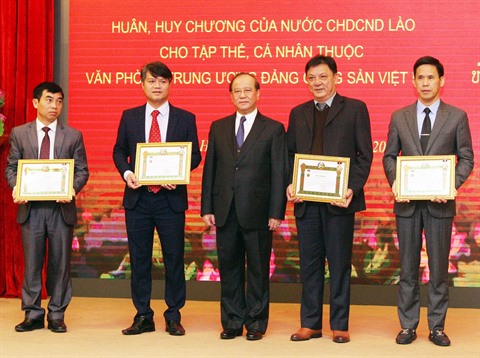 | Le ministre de l’Information, de la Culture et du Tourisme, Bosengkham Vongdara, remet l’Ordre du Travail de l'État laotien à des représentants de quatre collectifs du cabinet du CC du PCV. |