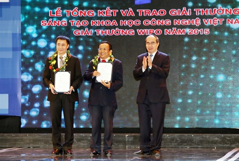 | Nguyên Thiên Nhân (droite) participe à la remise des prix de création scientifico-technique du Vietnam 2015 le 16 mai à Hanoi. |