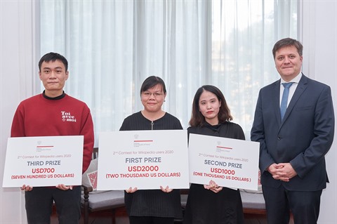 | Les trois rédacteurs primés lors la 2e édition du concours d’écriture sur Wikipédia, le 11 décembre à l’ambassade de Pologne au Vietnam à Hanoï. |