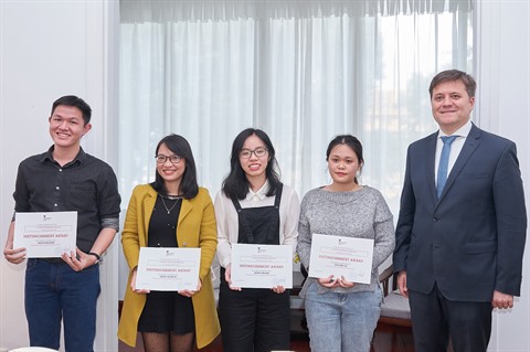 | Les auteurs des prix d’encouragement de la 2e édition du concours d’écriture sur Wikipédia, le 11 décembre à l’ambassade de Pologne au Vietnam à Hanoï. |