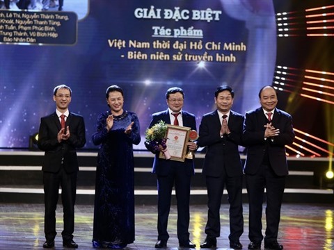 | Le Premier ministre Nguyên Xuân Phuc (1er, droite) et la présidente de l'Assemblée nationale Nguyên Thi Kim Ngân (2e, gauche) ont remis le prix spécial. |