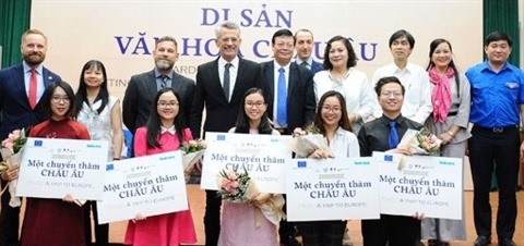 | Les 5 lauréats du concours d’écriture sur le patrimoine culturel européen (1er plan) le 4 mars à Hanoï. |