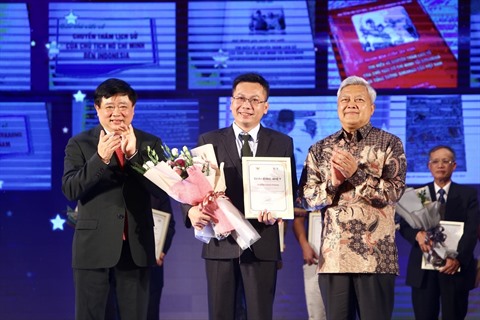 | Le directeur général de la Voix du Vietnam, Nguyên Thê Ky (gauche), et l’ambassadeur de l’Indonésie au Vietnam, Ibnu Hadi (droite), remettent le prix spécial à Tu Thanh Phong. |
