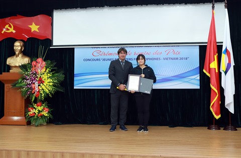 | Eric Normand Thibeault, directeur-représentant régional du Bureau pour l'Asie et le Pacifique de l'OIF, décerne le premier prix à Dào Phuong Loan. |