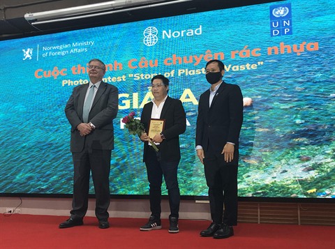 | Nguyên Giang Nam (centre), reporter pour le journal en ligne +Patrie+, reçoit le prix A du concours photo "Histoire de déchets plastiques", le 24 janvier. |