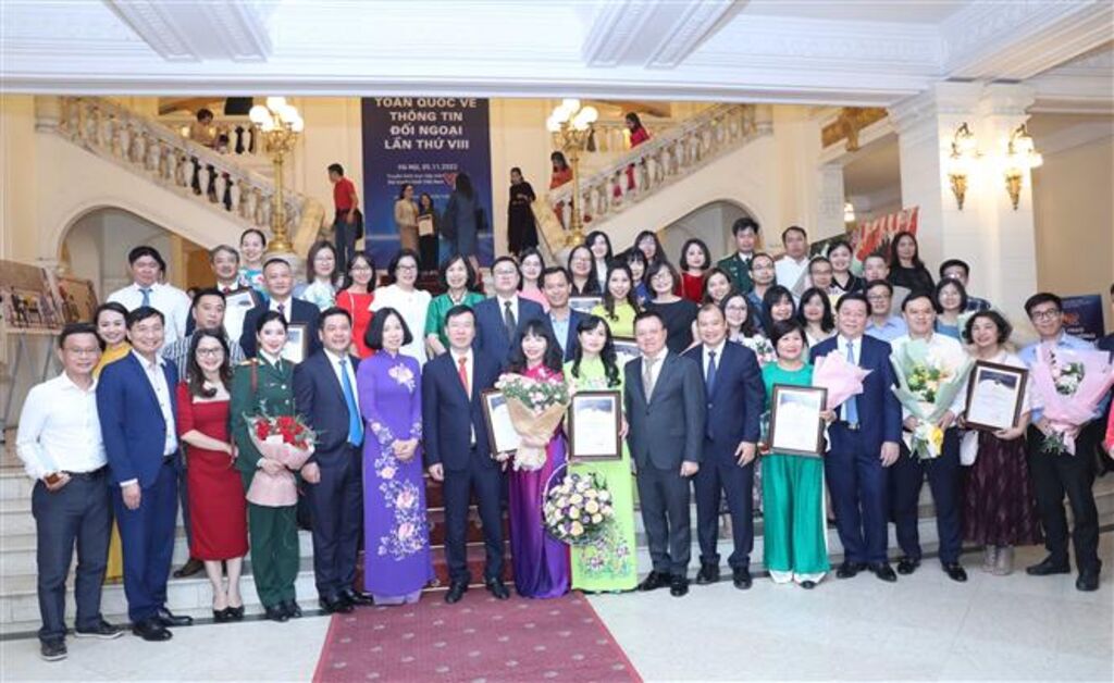 | Des auteurs et groupes d'auteurs lauréats de l'Agence Vietnamienne d'Information à la cérémonie de remise des récompenses du Prix national de l’information pour l’étranger de 2022, le 5 novembre, à Hanoï. |