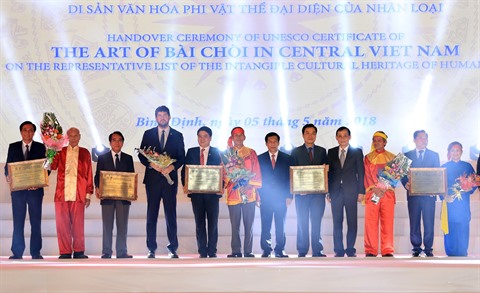 | Cérémonie de réception du certificat de l'UNESCO inscrivant le "bài chòi" au patrimoine culturel immatériel de l'Humanité, le 5 mai à Binh Dinh (Centre). |