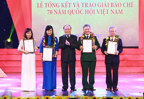| Le président de l'Assemblée nationale Nguyên Sinh Hùng (au milieu) et les lauréats du prix A, le 28 décembre à Hanoi. |