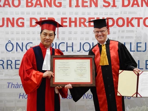 | Johann Erich Lejeune (droite) reçoit le titre de «Docteur honoris causa» décerné par l’HUMP-HCM. |