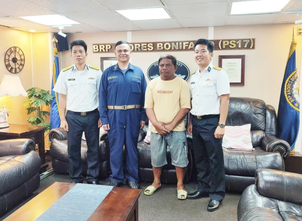 | Des cadres du navire 412 et le pêcheur philippin Allan Maglangit (2e, droite). |