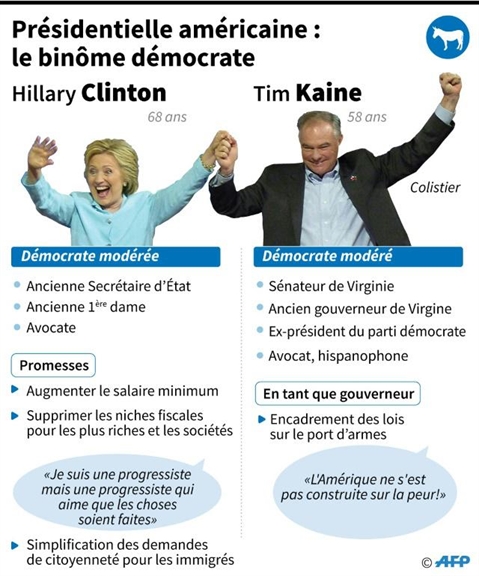 "La semaine prochaine à Philadelphie, nous livrerons une vision très différente de notre pays", a promis Hillary Clinton, 68 ans, lors d'un meeting samedi 23 juillet à Miami avec son colistier fraichement nommé, le sénateur de Virginie Tim Kaine, 58 ans. "Nous construirons des ponts, pas des murs, nous épouserons la diversité qui a fait la grandeur de notre pays".