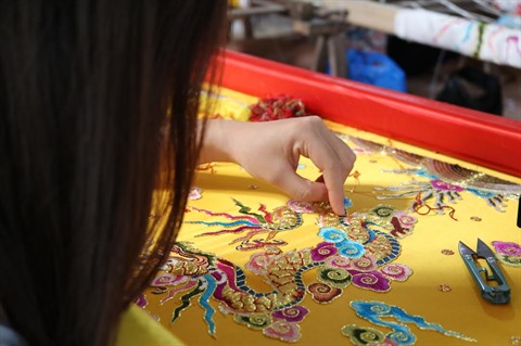 | Les jeunes artisans continuent de préserver les techniques traditionnelles de broderie qui font la particularité du village de Dông Cuu. |