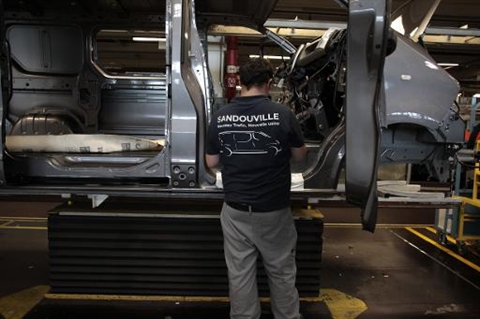 | Un employé sur une chaîne de montage le 30 septembre 2014 à l'usine Renault de Sandouville. |