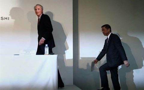 | Le président de Renault, Jean-Dominique Senard (gauche) et le patron exécutif de Nissan, Hiroto Saikawa, arrivent au siège de Nissan à Yokohama, dans la banlieue de Tokyo, pour donner une conférence de presse, le 12 mars. |