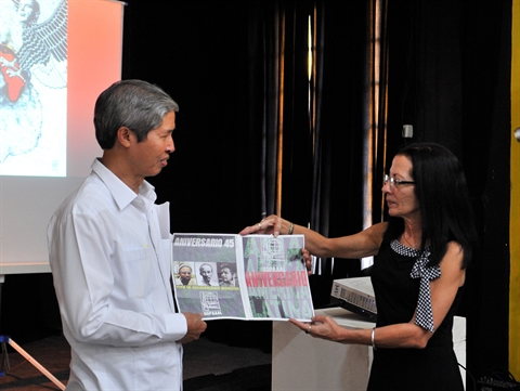 | La secrétaire générale de l'OSPAAAL, Lourdes Cervantes Vasquez, remet le 2 décembre à La Havane un poster sur les relations bilatérales Vietnam - Cuba à l'ambassadeur vietnamien Duong Minh. |