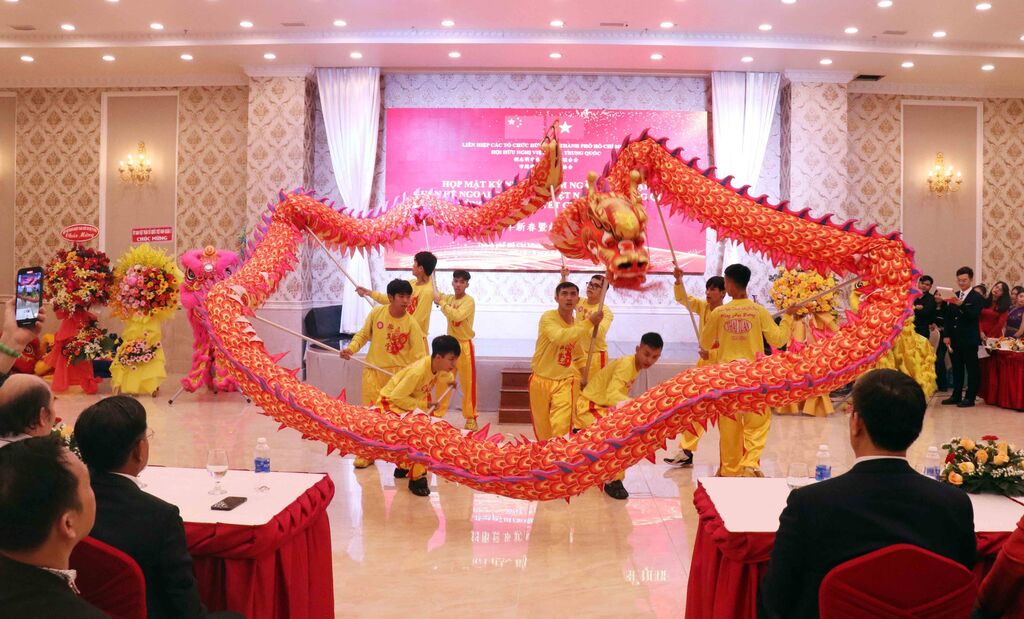 | Danse du dragon à la rencontre lors du 74e anniversaire des relations diplomatiques Vietnam - Chine. |